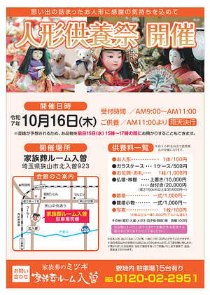 家族葬ルーム入曽にて人形供養祭を開催いたします。開催日時 令和7年10月16日(木) 雨天決行 受付時間 AM9...